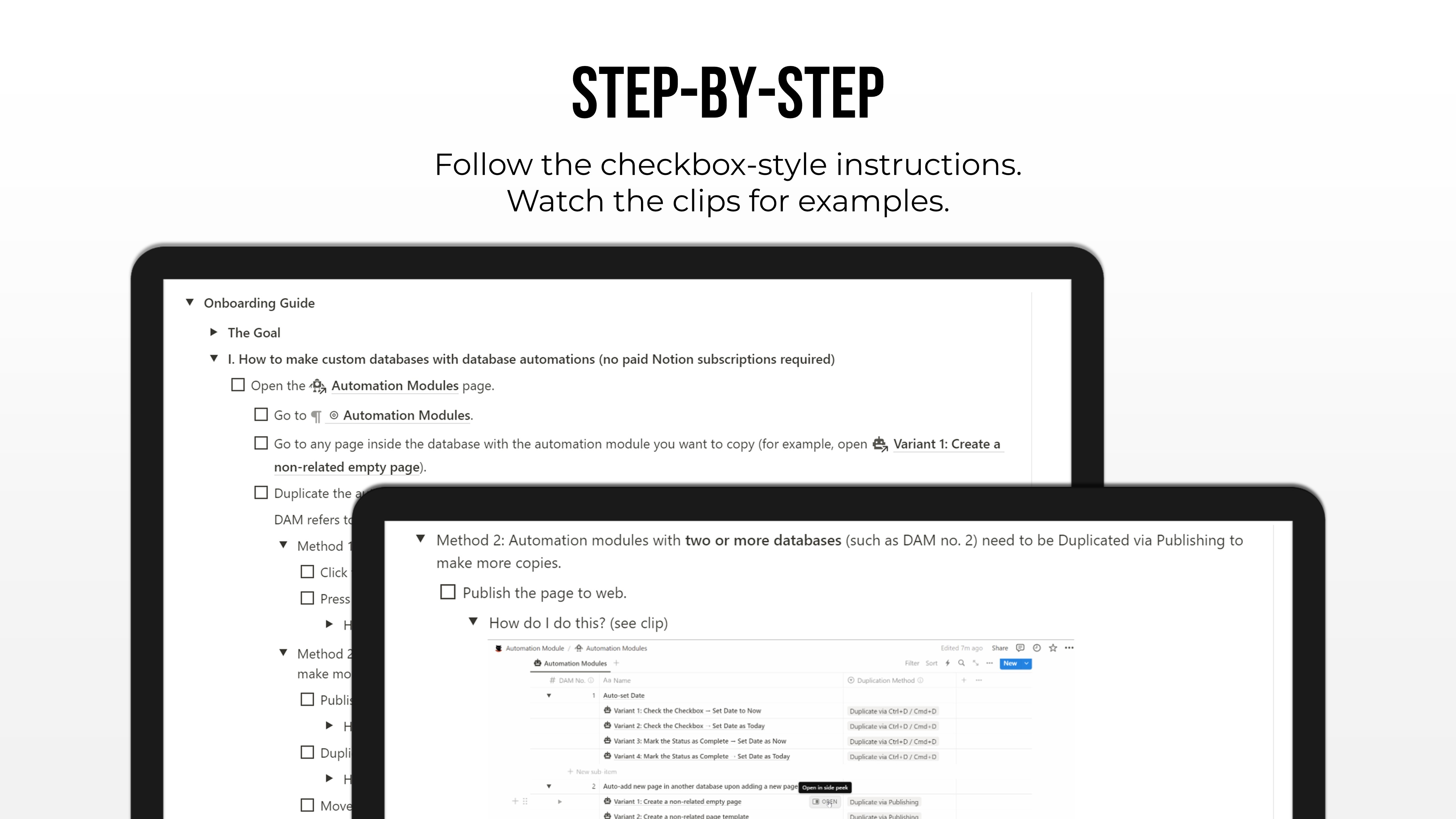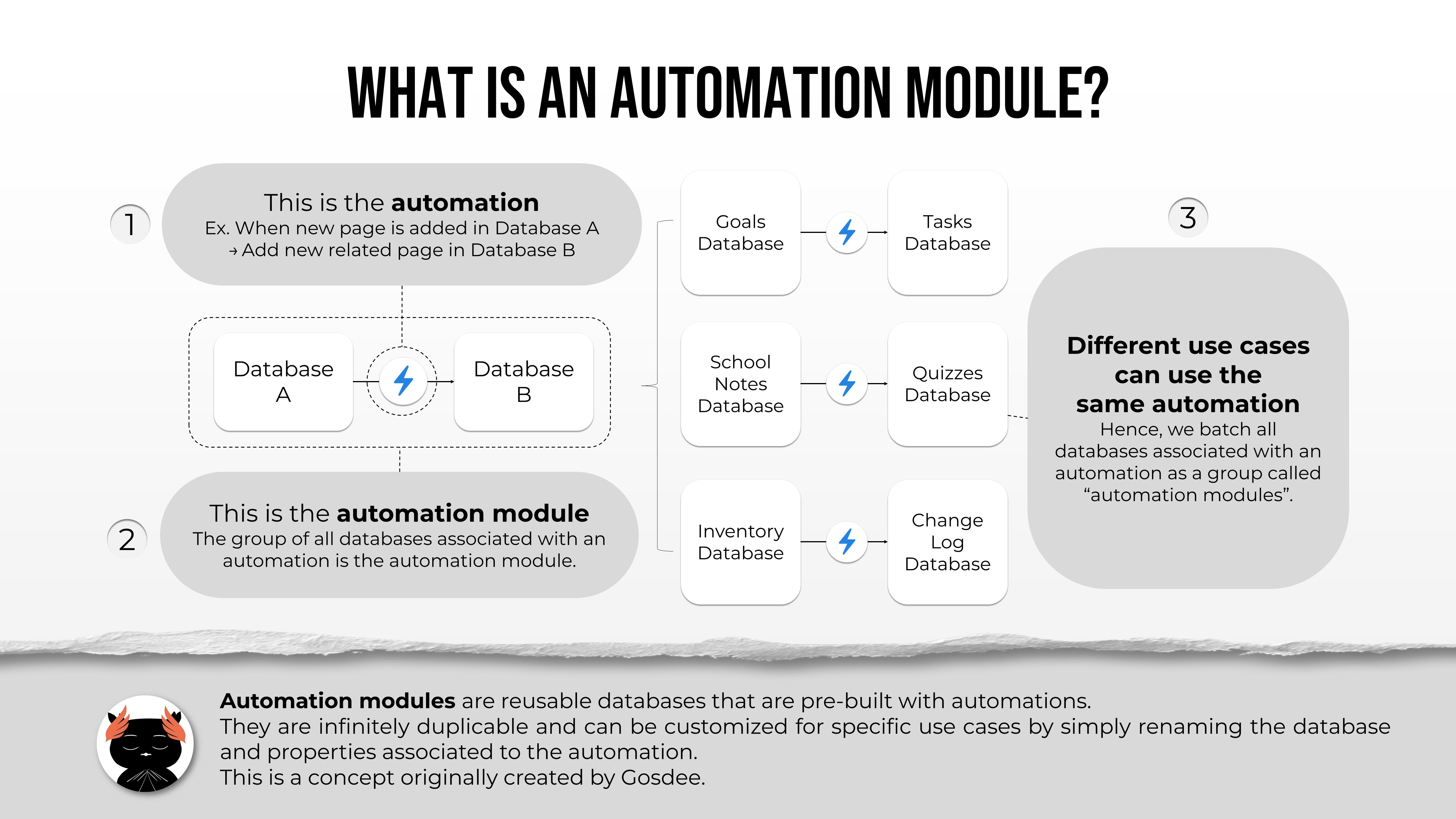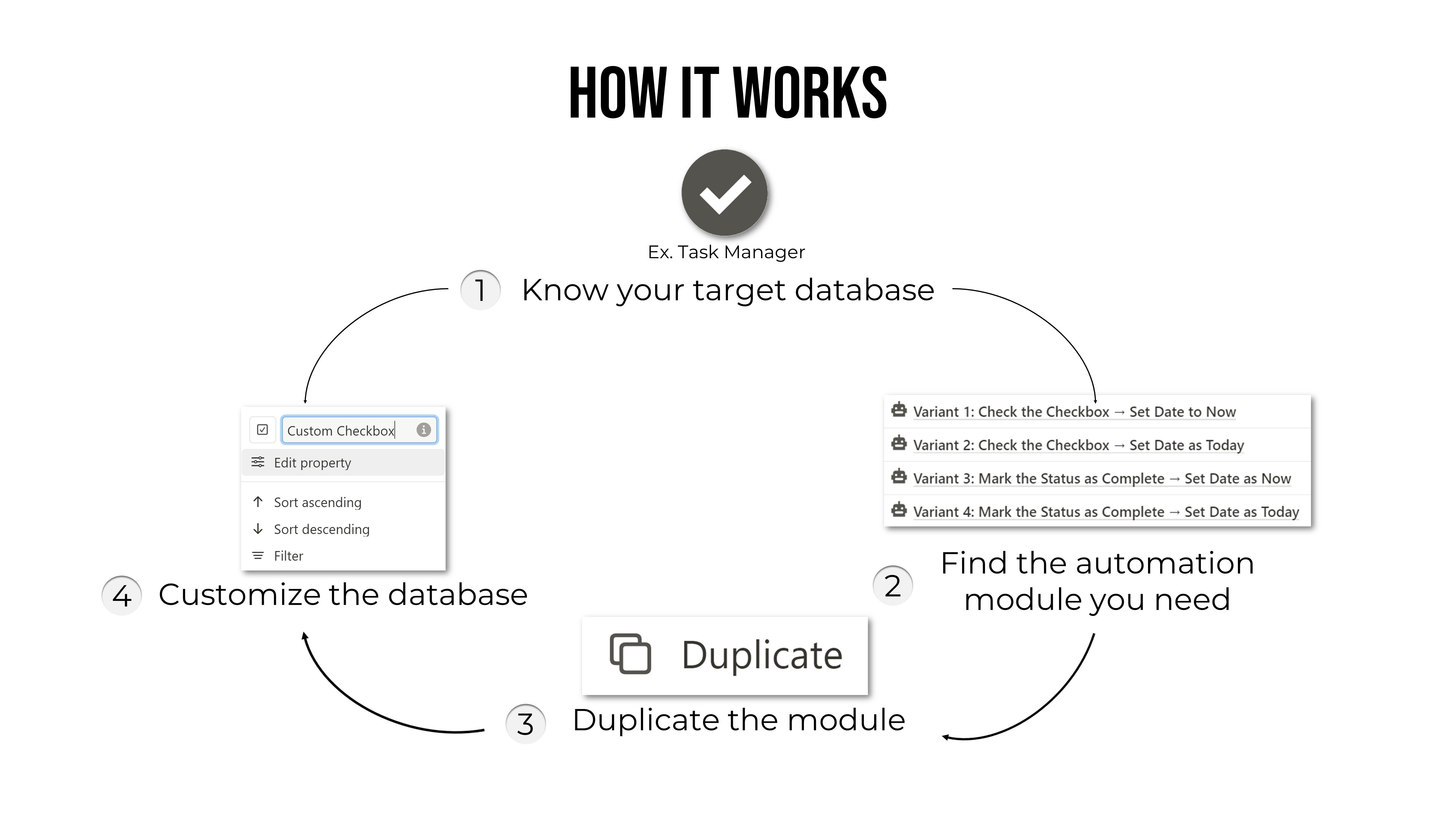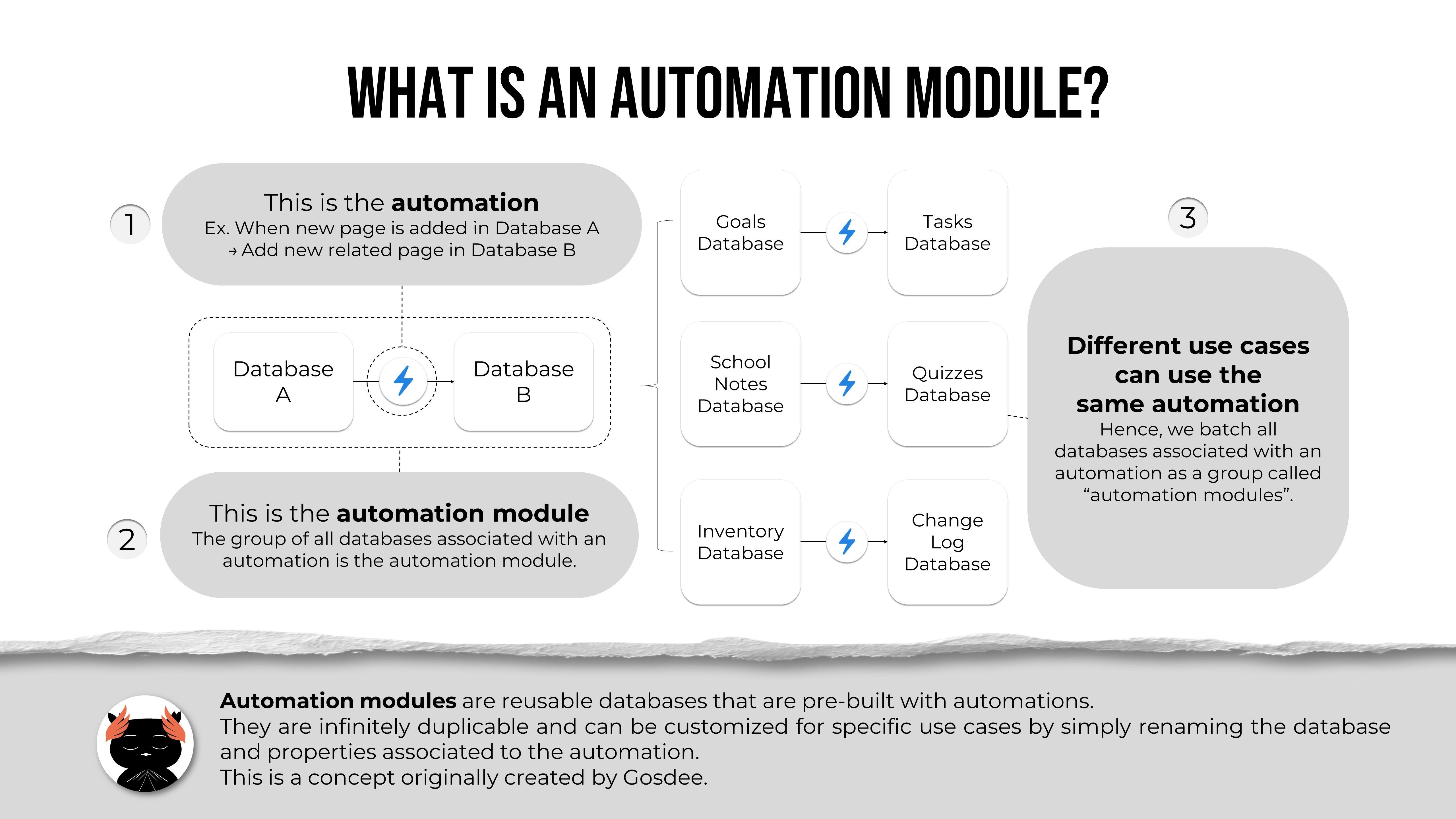 Use this Notion Automation Modules to make reusable copies of databases with pre-built automations! Just change the property names and duplicate the databases as much as you want to suit your needs.
