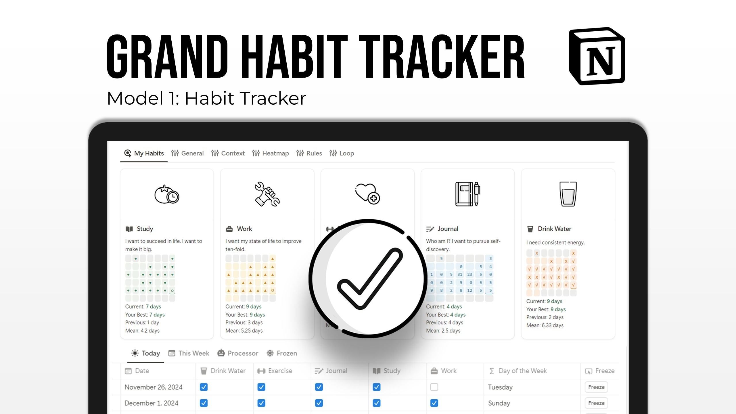 Habit Tracker (Notion Habit Tracker: Model 1), the high-end habit tracker for building and systemizing your everyday habits inclusive of all aforementioned auxiliary features in one cohesive Notion system
