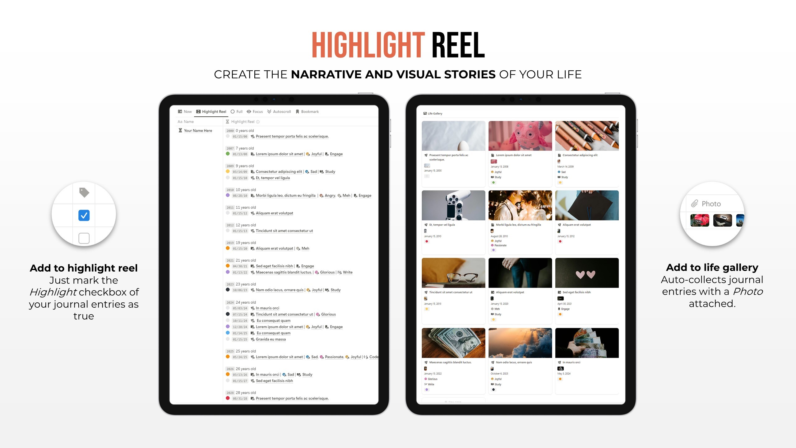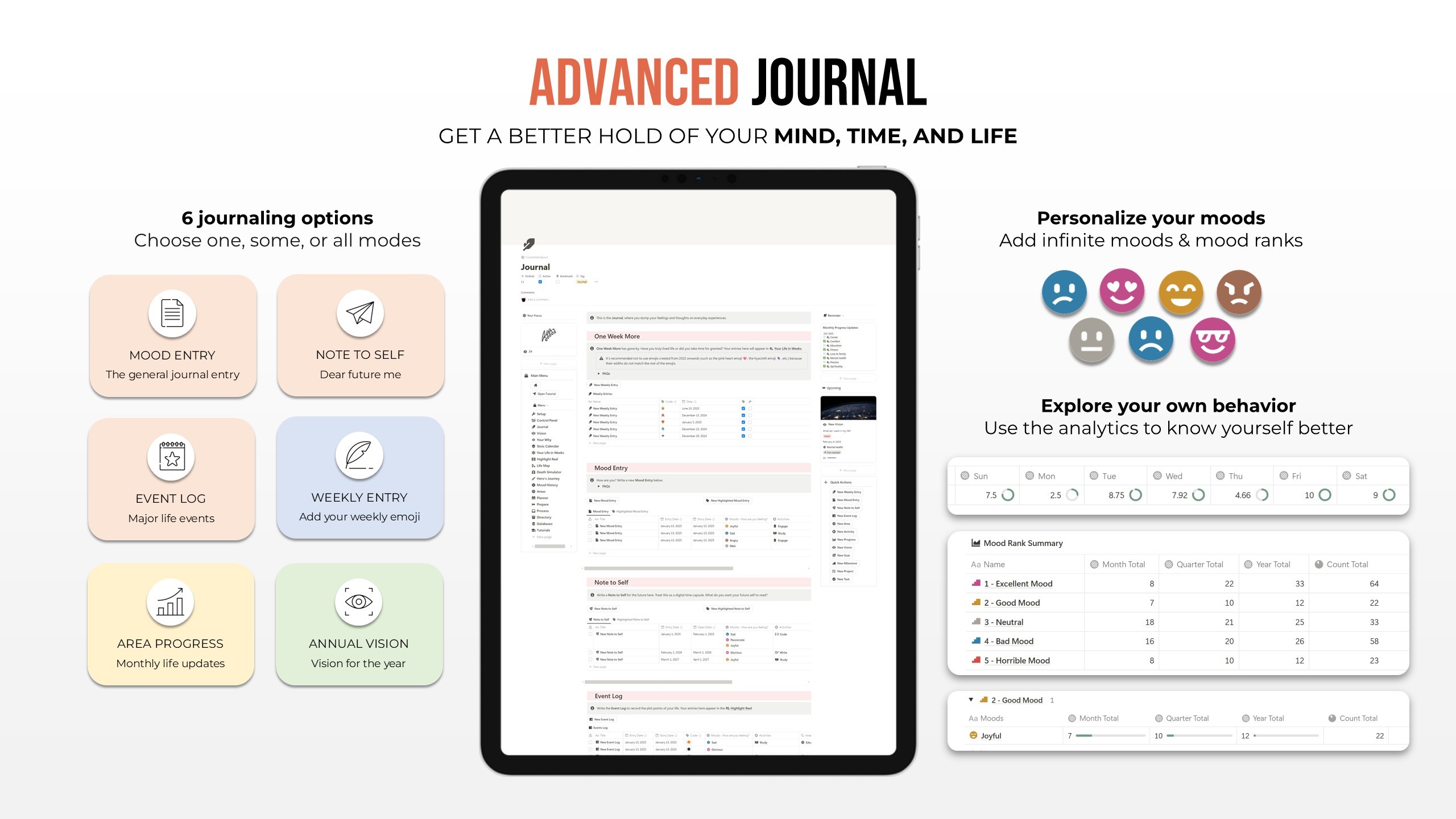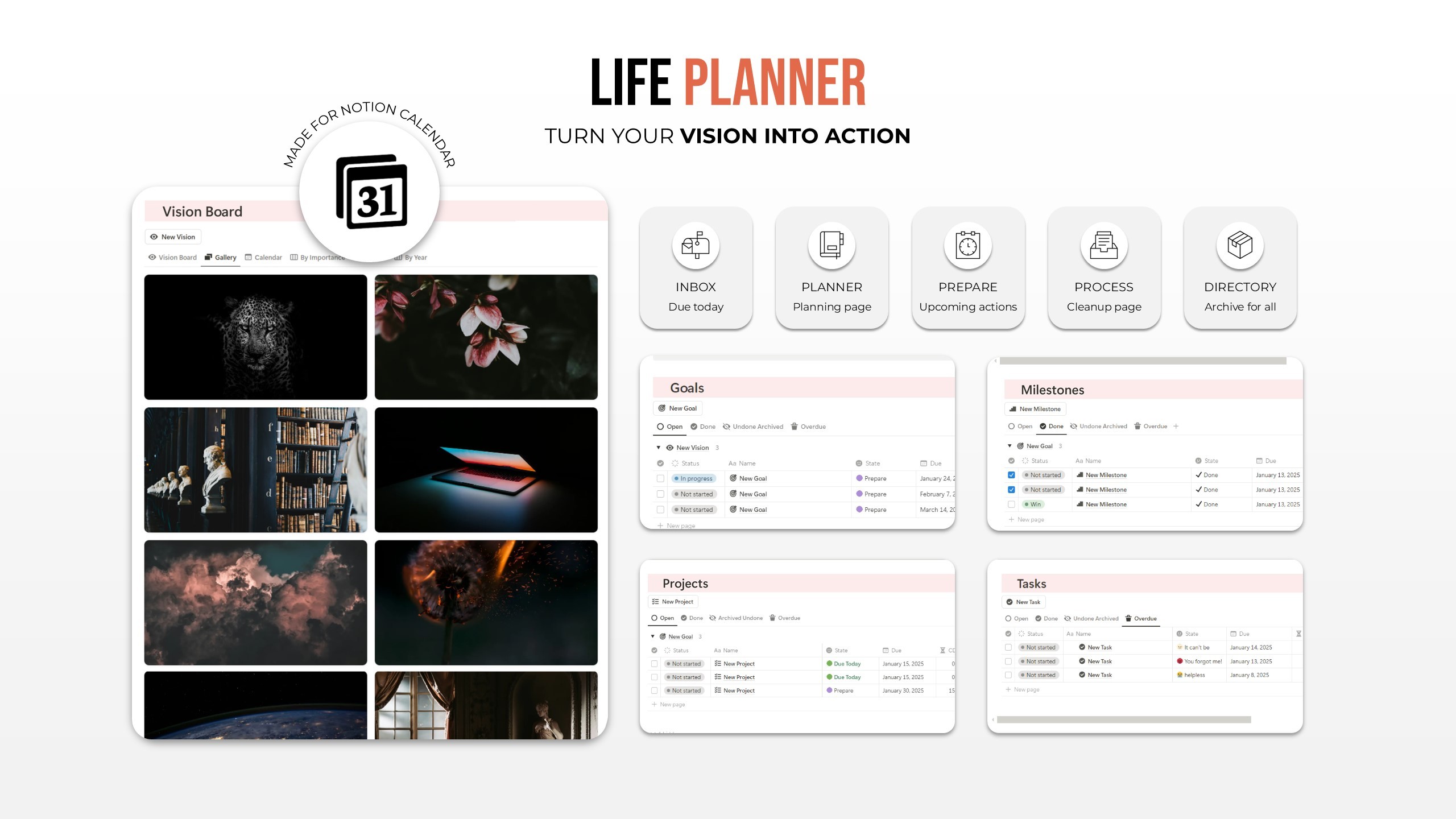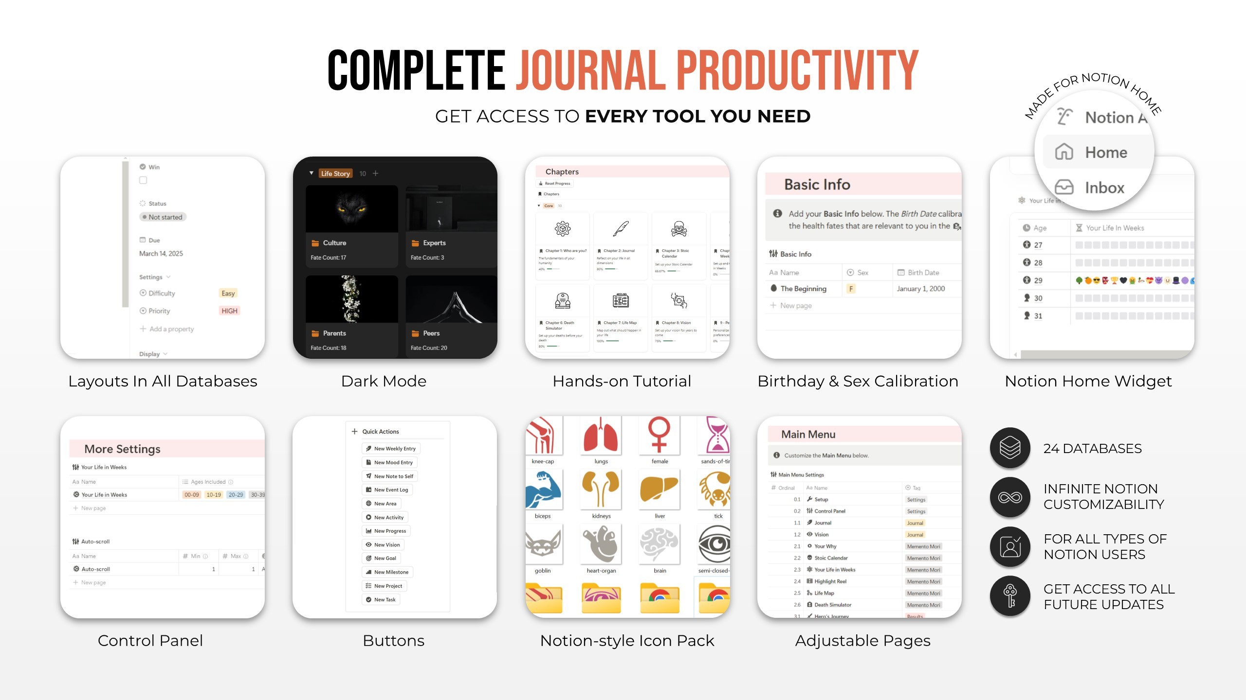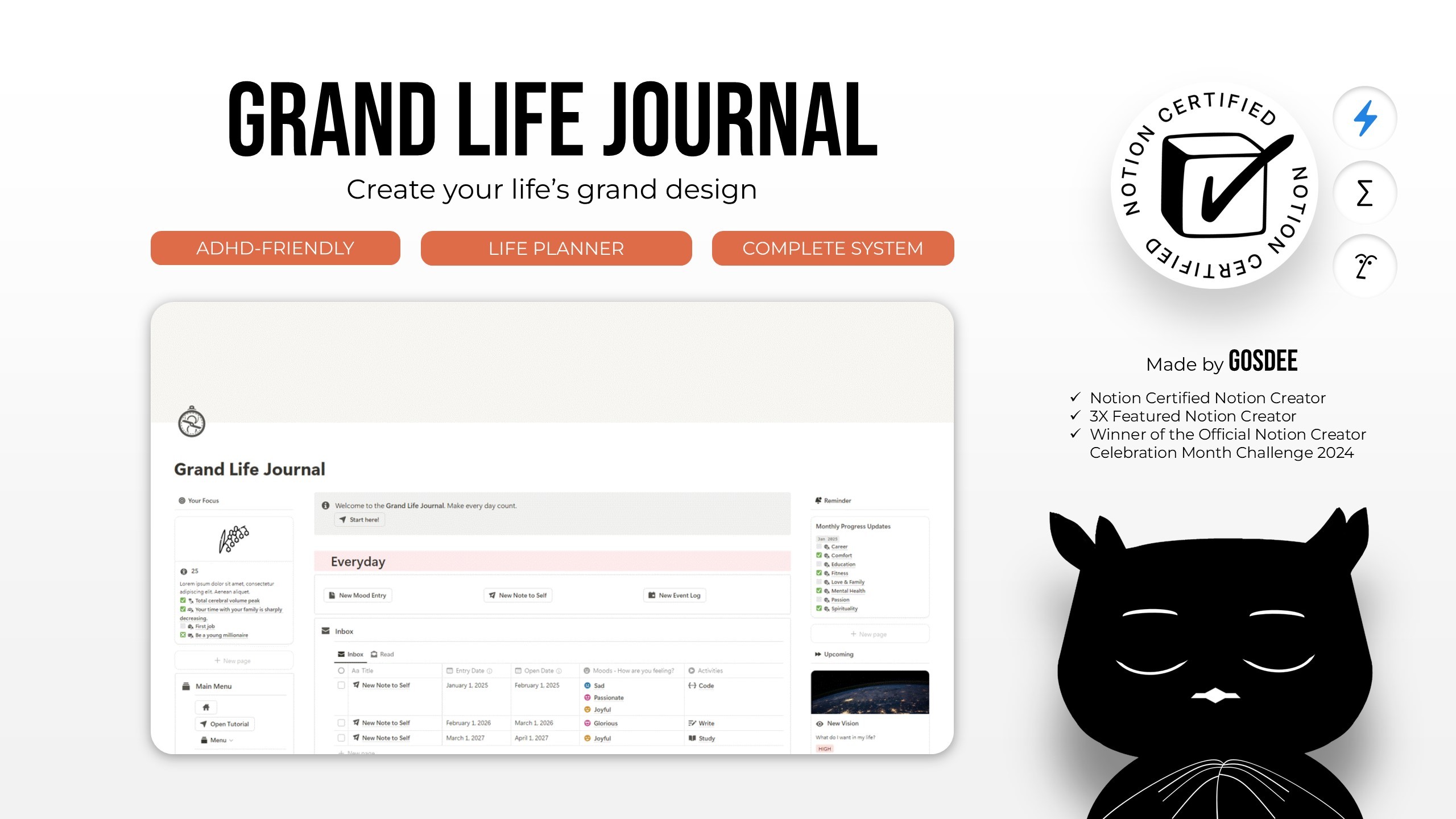 The Grand Life Journal, a highly visual-oriented journaling Notion system that lets you write about your past, present, or future, gamify yourself into mindfulness, and plan your life from a macro scale, inclusive of all aforementioned supporting systems