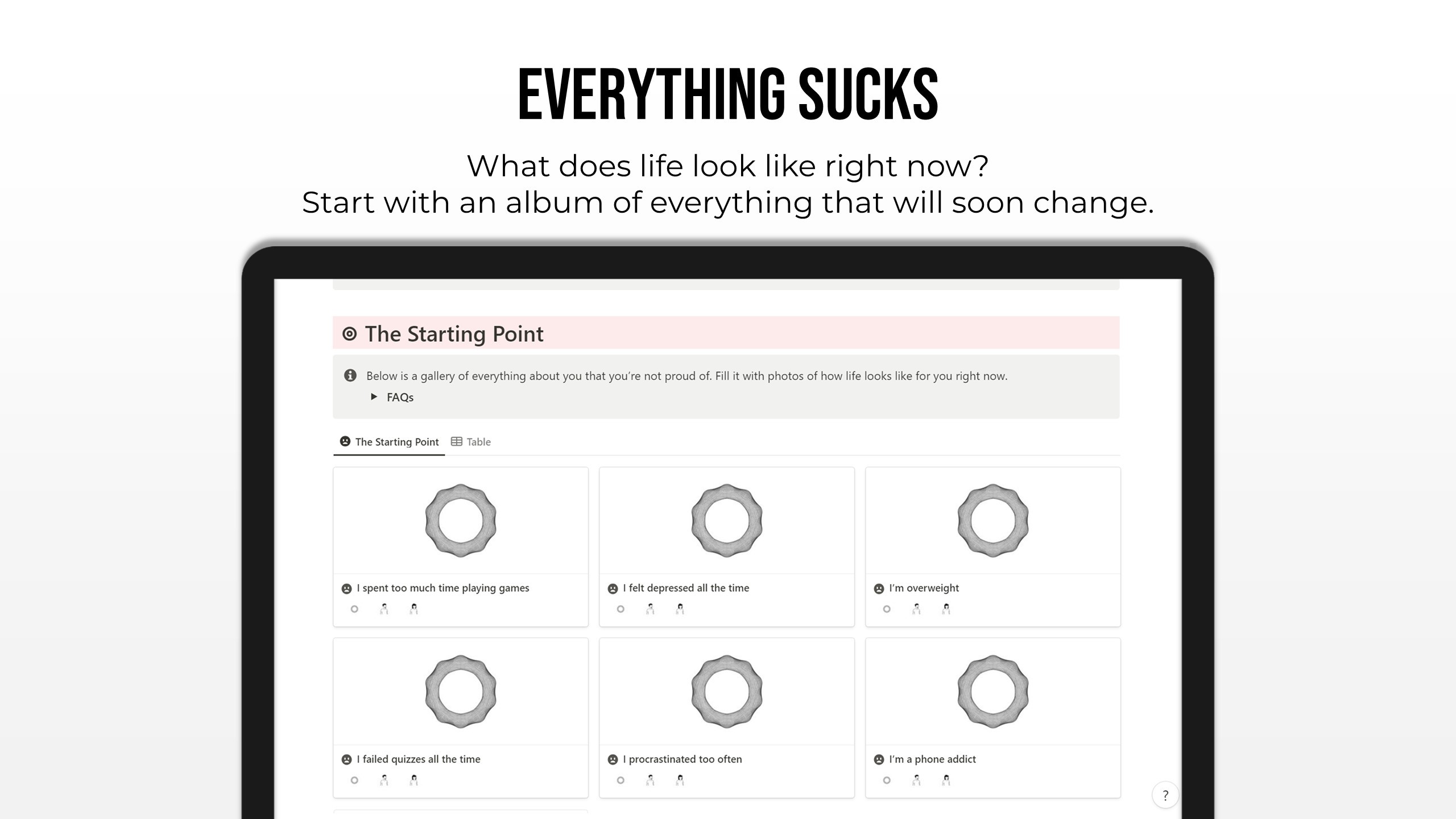 What does life look like right now? Make a digital screenshot your life: how you look, failures, screen time, play time, and everything you want to change. Place them all in an album.