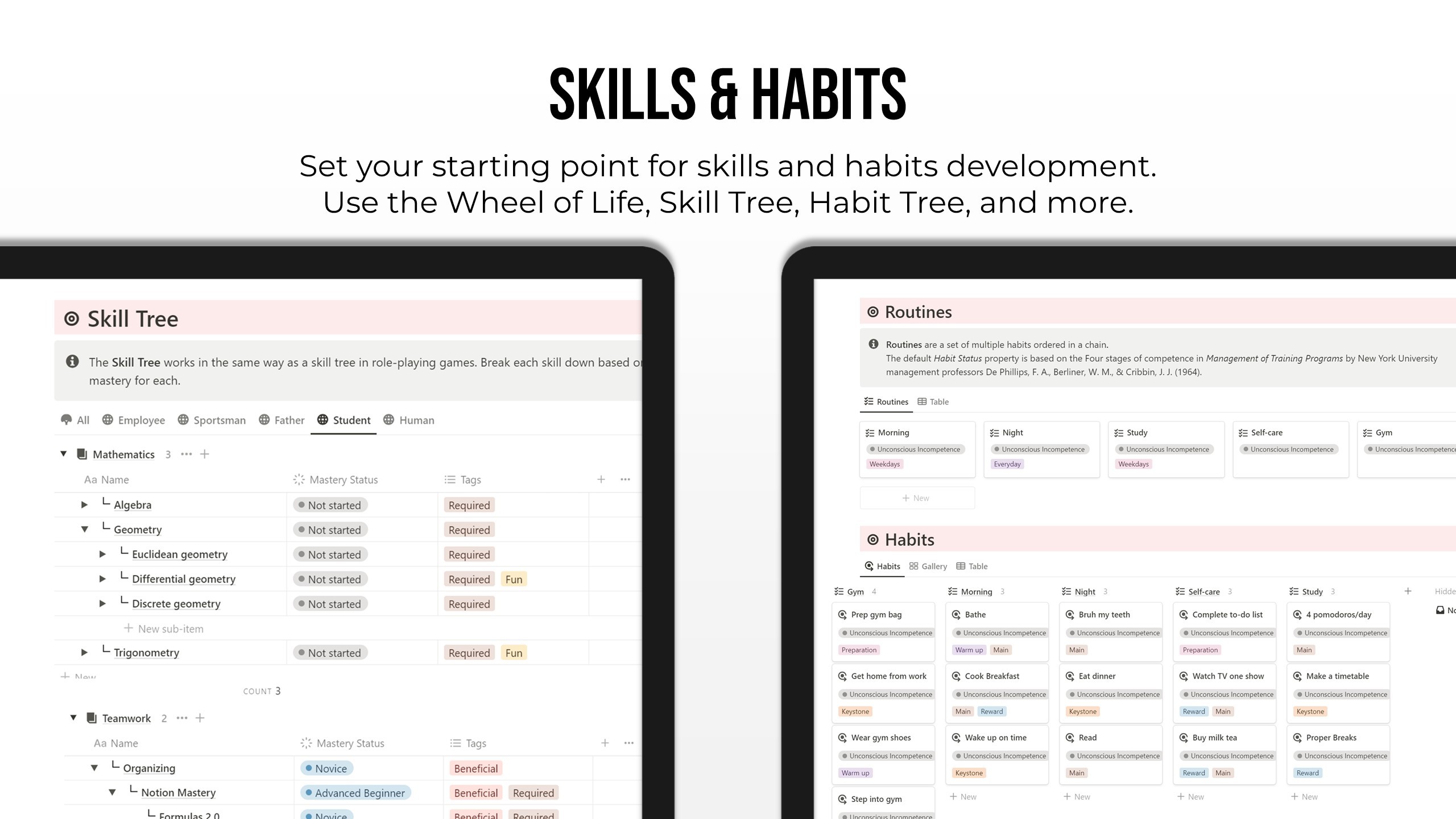 Have a clear picture of how your skills and habits look like today. Use the easy-to-use skill and habit tree and the other features to map yourself out .