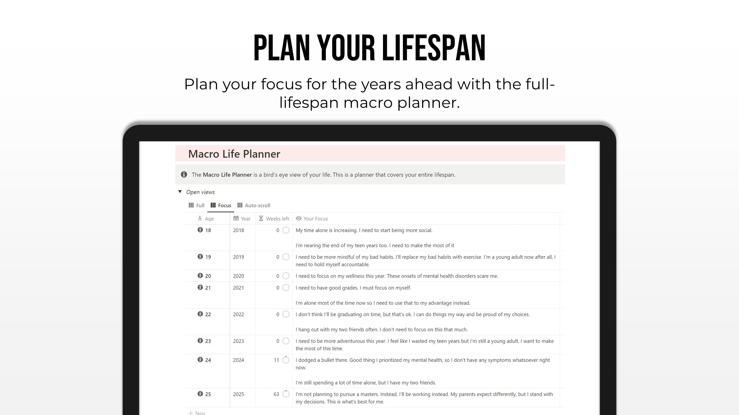 Imagine what your life will be like one, ten years, and decades beyond today. Use this to plan ahead with your life's time limit in mind.