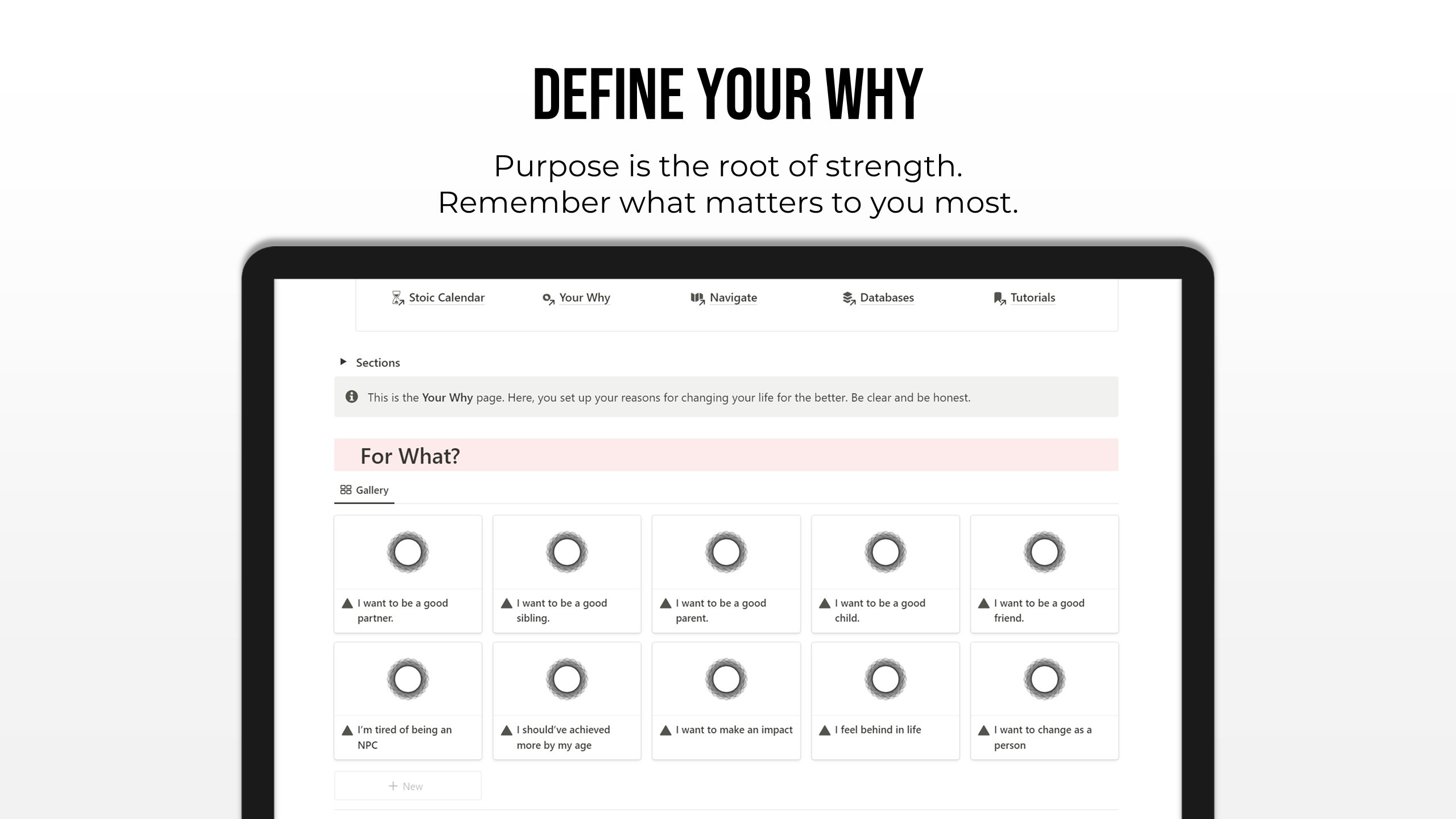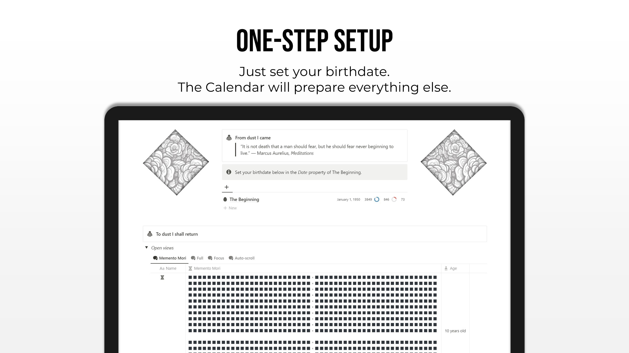 The Stoic Calendar is the first fully-automated stoic calendar in Notion. The white squares will automatically turn black to represent each passing week.
