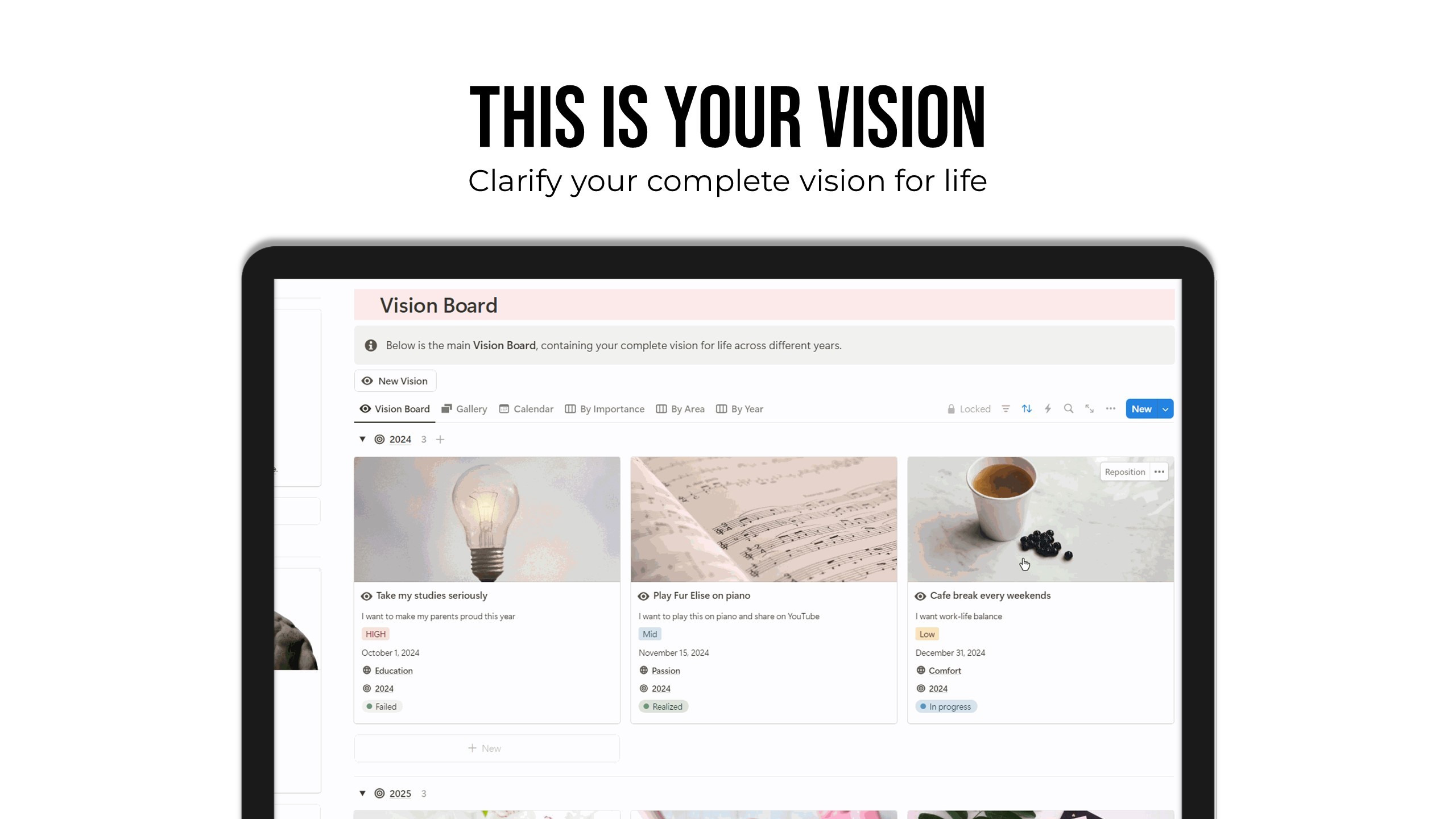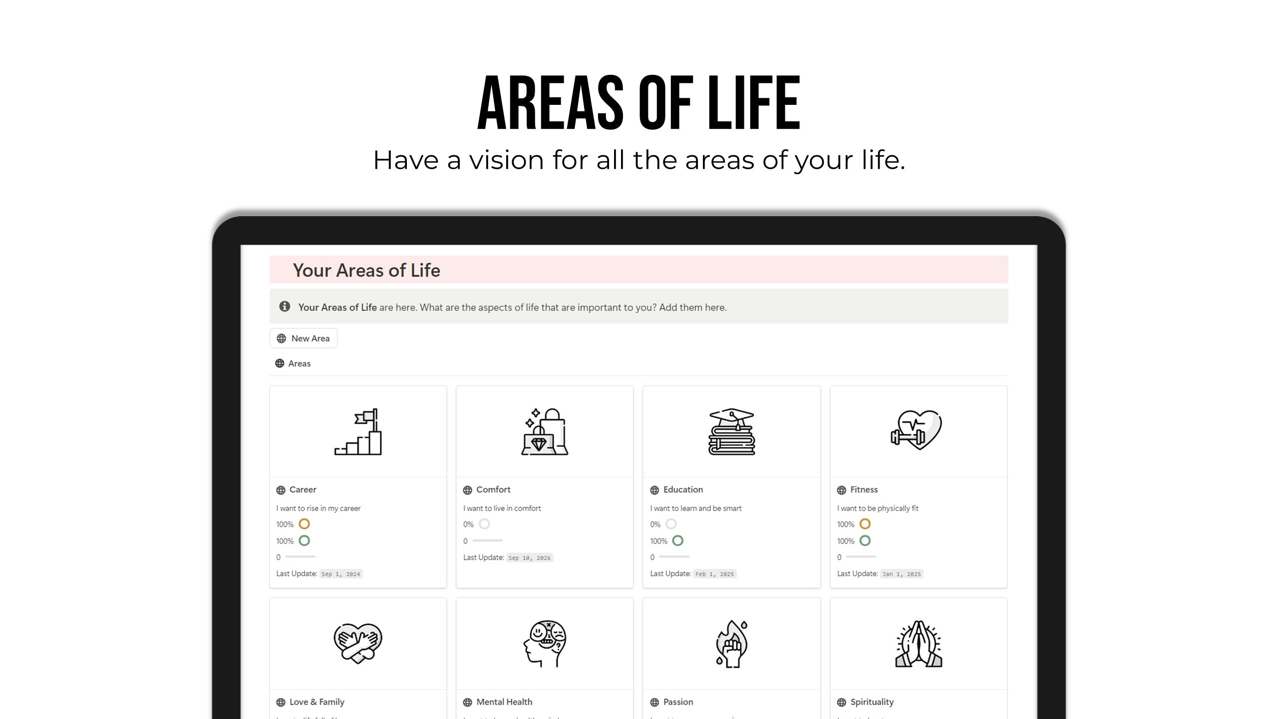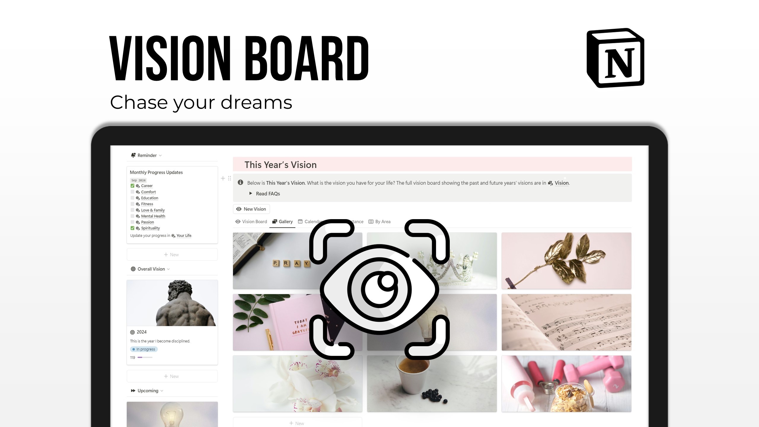 A vision board Notion template complete with a full vision board, annual vision updates, monthly progress reminders, and life areas.