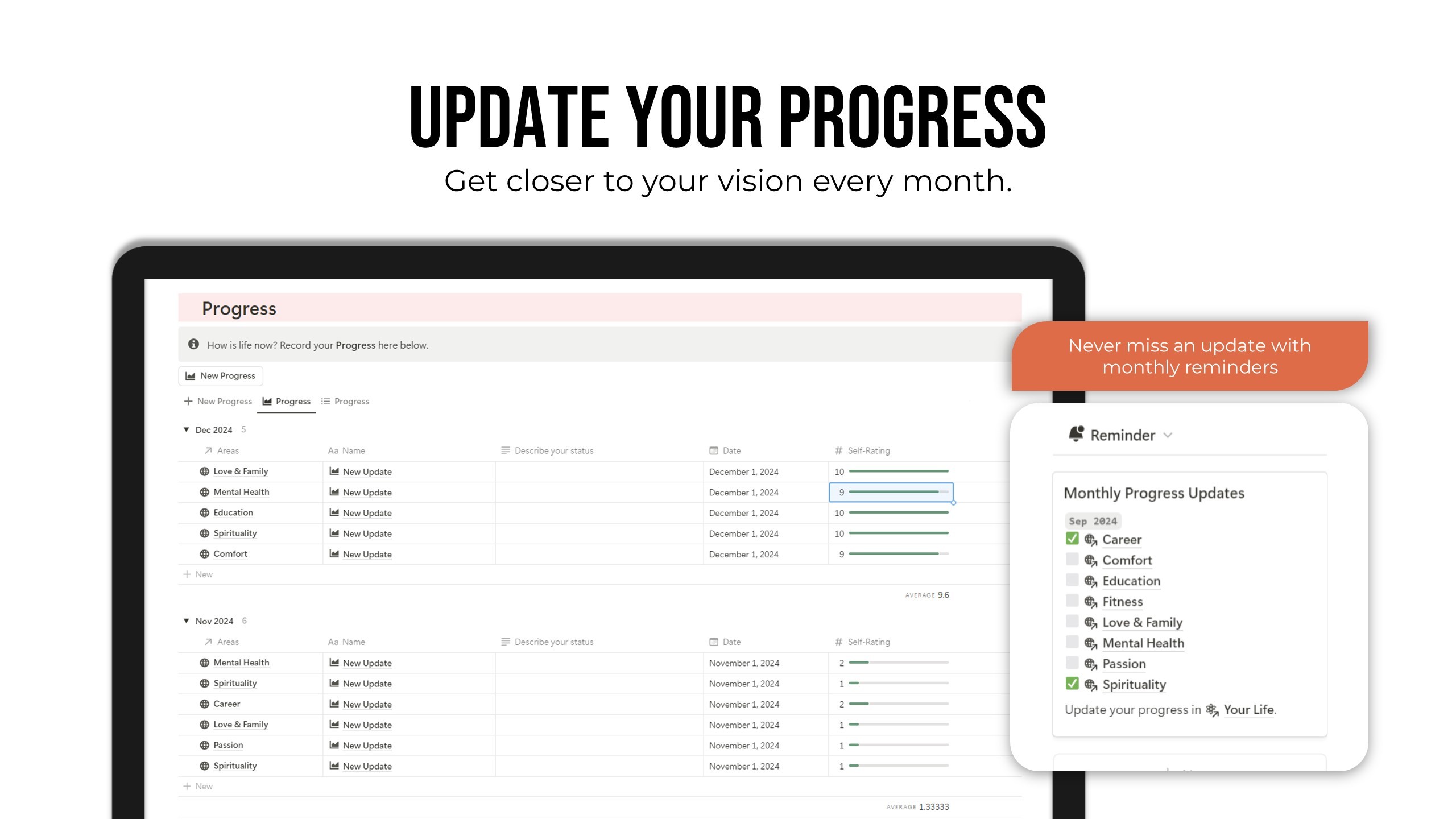 Get closer to your vision every month. Adding progress monthly ensures you get things done.
